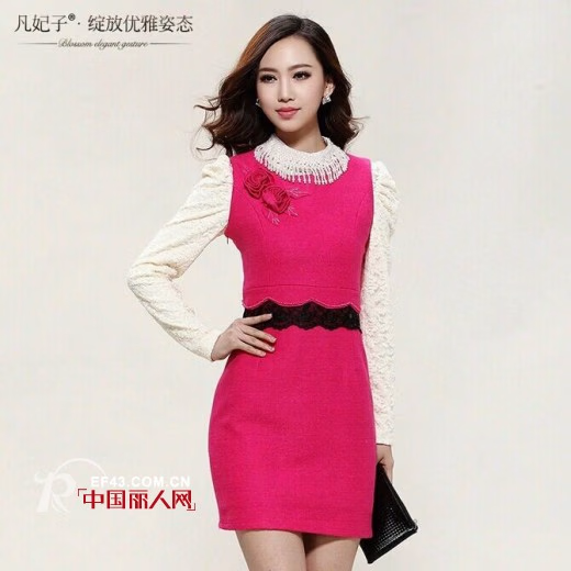 这件凡妃子的连衣裙枚红色,糖果色的甜美总是让人无法拒绝。毛呢面料十分的保暖,韩版的设计收腰修身,黑色的细节蕾丝点缀,假式的腰带很有特色。玫瑰胸花绽放了优雅的姿态。这样气质的裙装不管搭配什么样的衬衫都会很好看。当然,图中白色的蕾丝衫相搭配的十分完美哦。