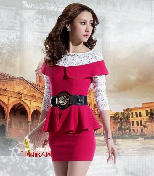 这件套裙一眼就足够让人喜欢。首先从色彩方面,白色和玫红色亲姐撞色,精彩纷呈。一字蕾丝领,勾勒了迷人的女人锁骨线条。复式娃娃领甜美青春。黑色的腰带勾勒了女人纤细的腰部,褶形衣摆衬托着包臀裙,线条完美。