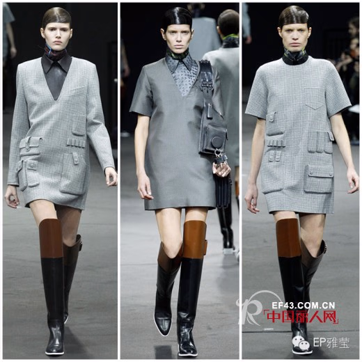 这次,Alexander Wang 带来了大量H型连衣裙,新的亮点在于内搭以及裙身的面料,“像男孩一样”有着中性的冷静。可以注意两种搭配方式,V领连衣裙的内搭配合翻领,小圆领在搭配翻领内搭时无需翻出领部。