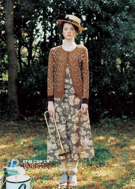 短款的针织开衫小毛衣还带有波普风格,白色的小波点不规则散步,凸显年轻可爱,打底的长款连衣裙颜色和图案都偏自然的大地色,雪纺的面料飘逸感十足,蕾丝花边的短袜带着田园般的清新感,更加贴近大自然。
