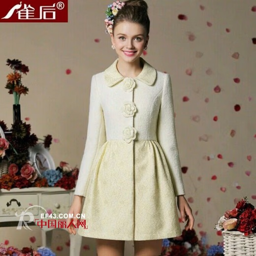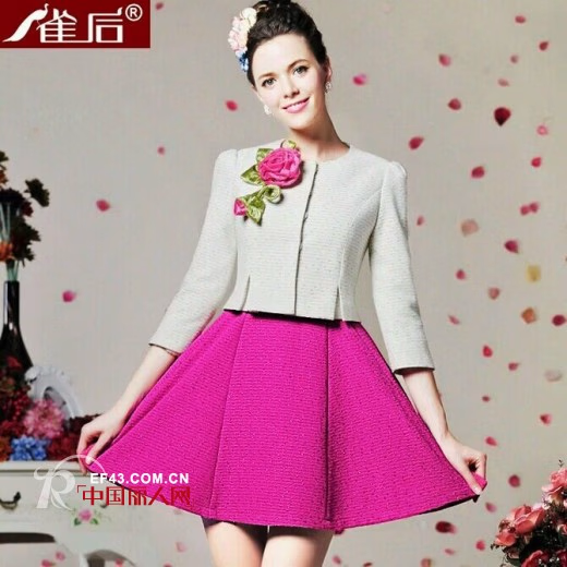 这件七分袖的廓型裙可以在里面穿上白色的长袖衫。白色的小开衫配上玫红色的伞形裙,气质淑女。细节的开叉,玫红色月季花的点缀,衬托的女人温婉甜美。雀后女装确实能根据人们的需求带给人们美的享受。