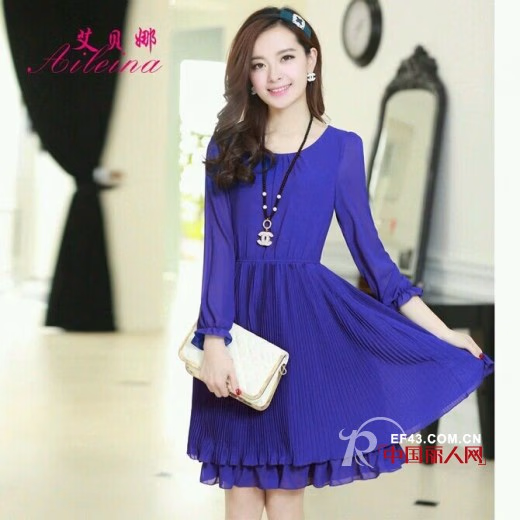 这件宝蓝色的圆领连衣裙走在路上也十分的抢眼。双层裙摆色设计不仅防走光还十分的美观。宝蓝色显瘦衬肤,搭配一条黑色的香奈儿链子,坡跟的鱼嘴鞋,让女人散发出成熟温婉的气质。