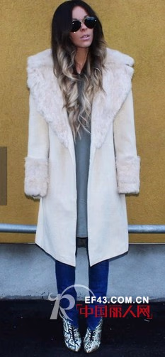这件羊羔绒的白色大衣很有冬季的厚实感,敞开版的设计,很有女王的霸气范儿。里面穿上一年蓝色的针织衫,下面搭配一件宝蓝色的裤装,很是大牌。