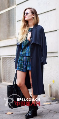 这件宝蓝色的长款大衣给人一种神秘的感觉。银色的珍珠扣点缀的很是复古。里面搭配套装的格子衬衣,欧美范儿十足。方形的大包也很有特色哦。
