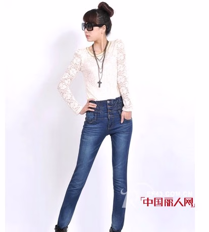 高腰的牛仔裤不但有型有款,对女性最受不得寒气的小腹也有很好的保护作用,高弹力的松紧腰设计,对减轻“游泳圈”也有一定的塑形效果。水洗做旧的图样经过精心设计,不动声色地修腿显高挑。