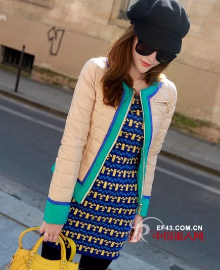 这件蓝绿粉三色拼接的小短袄,看上去就十分的轻便灵活。处处洋溢着青春学院风。这样的小短款袄最好搭配里面穿上一件长款的针织裙或者针织衫。亮色系的最好了,下面就搭配一件黑色的紧身裤吧。