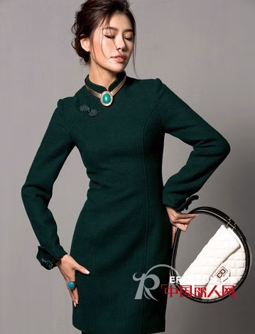 在中式服饰中旗袍一直被誉为最具女人味的款式,因此在近代的时装发展史上总能占一席之地,甚至在全球都拥趸无数。这些年,它的款式通过设计师们的精心改良更加贴合时代的审美观,又保留其独特的妩媚美感。墨绿色的清新和呢料的挺括全面展露你的知性气质,颈间佩上一串金属项饰更显仪态万方。