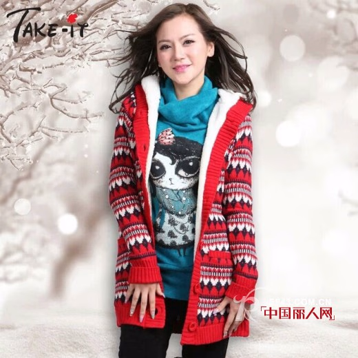里面是白色的羊羔绒内衬,外面是大红色的针织衫。各种颜色的花样图装饰,很有特点。里面搭配一件短款卫衣,十分青春活力。这样的搭配远比羽绒服来的减龄与俏皮。