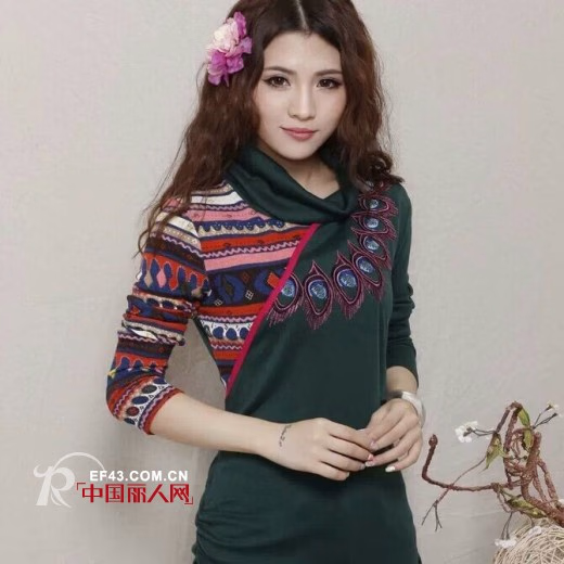 这件以墨绿色为主打色的衬衫修身的设计,亮点还是属于胸部以上部分。折叠的圆领衬托的肤色白皙光滑。孔雀尾的细节装饰,有灵动的感觉。拼接的设计有少数民族的韵味。