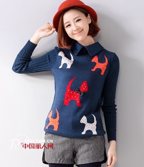 奔跑在衣上的小动物把深蓝的色泽调理的欢快活泼,适时在动物脖子上系个小蝴蝶结,除了营造甜美趣味,还增加了毛衣的立体效果,再加上小翻领的知性雅致让毛衣妙趣横生。宽松的版型内搭外穿皆出彩哟!