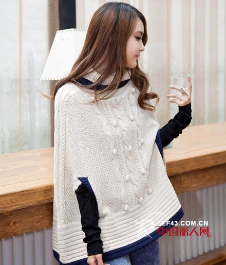 不是所有的故事都一帆风顺,就好像拼色也不会永远高调,有时候边边角角零零碎碎也能让色彩大放异彩。针织斗篷不像毛呢那么挺括,多了几分温情多了几分俏皮,袖口领口和下摆的蓝色拼接深浅过渡细节处彰显耐心。