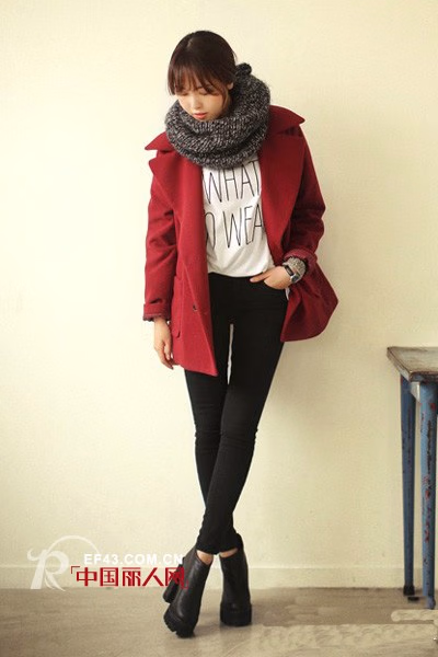 冬季爱美的你,是不是显不够显瘦呢?这款红色大衣款式,搭配白色T恤一条高腰打底裤,一双高跟短靴,花灰色围脖,俏皮且大方的装扮,黑色显示腿型,红色衬托亮丽肤色,在冬季这样的装扮绝对是吸睛哦。