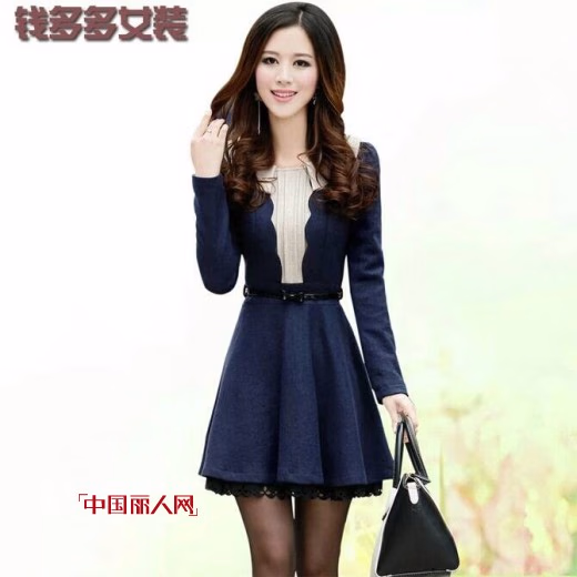 这件墨蓝色的韩版拼接裙十分的修身显瘦。贴身的呢子面料优质舒适。荷叶摆和荷叶领,相互呼应,衬托的女人像是荷花,幽静的在自己的水池里绽放。胸前的针织拼接独特时尚,点亮整体。黑色的腰带勾勒了曲线美。