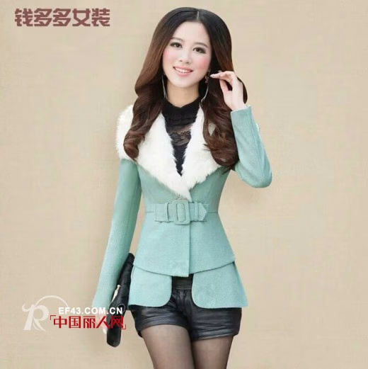 薄荷绿会给人一种田园清新的美感。这件韩版的修身外套白色的羊羔绒毛领外翻,衬托的女人更加的秀丽。收腰的设计干练利落,很有白领的时尚感。下面搭配一件黑色的打底裤和皮短裤就会很有女人味了。