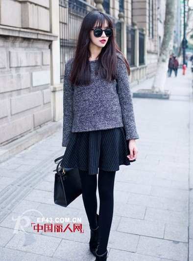深灰色短款套头毛衣,简单大方的款式,百搭时髦,透着迷人的味道。短款精致,穿在身上显高挑。搭配竖条纹短裙,配上黑色裤袜和高跟短靴,韩范儿风格,显高有气质。