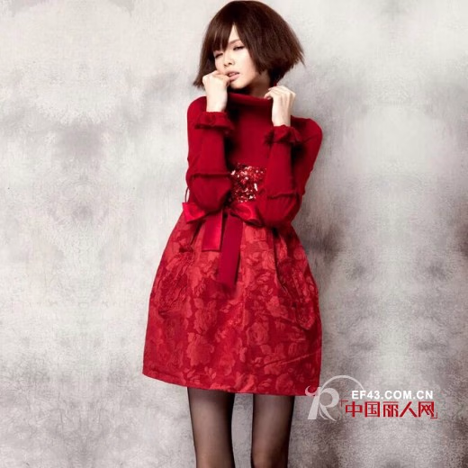 这件酒红色裙装公主裙的设计,高领的羊毛衬托着肤色,减龄保暖。独特的灯笼袖很有特色。蝴蝶结的装扮更加俏皮,下面的印花裙更是喜庆。