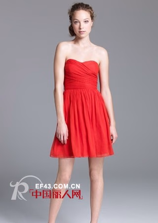 抹胸正红色的小礼服很是抢眼,但也能抢了新娘的风头。建议在新娘穿着中式礼服时,伴娘可以集体配合换上红色伴娘服。