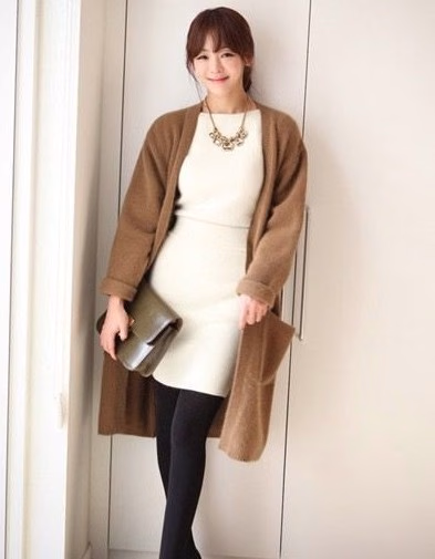 驼色的大衣在冬季可是很经典的,简单的颜色和版型,在冬季随意搭配上都很有时尚感了,无领的设计很时髦个性了!过膝的长度搭配上高跟鞋,一样显高挑感了!内搭上白色的针织衫款式连衣裙,收腰裙子很显小女人的性感哦!