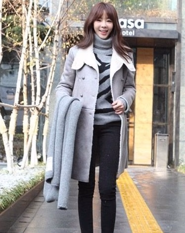 这样款式的羊羔毛大衣在今年可是最流行的哦,穿在身上也是最保暖的了,翻领的大衣穿起来就很大气了,高领的毛衣搭配上黑色的紧身裤和短靴,这样看起来就很高挑了,而且很时髦拉风哦!