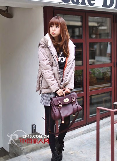 一款小个子女生的钟爱,短款粉色棉服,大大的领子设计,配上一件条纹打底衫,高腰小脚裤,即显高挑又很显瘦,黑色裸靴加黑色手提包很赞的搭配。