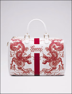 为了庆祝在中国开店,庆祝他们一个新鲜欲滴的利润点,品牌通常都会特别设计一款带有中国特色的限量款来贺喜。比如Gucci Shanghai Dragon Bag,就是为了庆祝上海全新的旗舰店开幕而精心设计的。这款包包以Gucci GG Boston手袋为蓝本,因为经典简洁的款式最适合在上面做文章。白色帆布底上印着对称的赤龙形图腾,中间是Guccio Gucci手写签名之经典Gucci标志,红色与白色的鲜明搭配,完美演绎了中国龙的大气与震慑力,产生强烈的视觉冲击,中国风扑面而来。