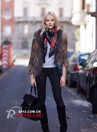 白色针织套头衫+黑色紧身牛仔裤+咖啡色皮草外套+黑色长靴+红黑玫瑰印花丝巾+黑色皮革手提包