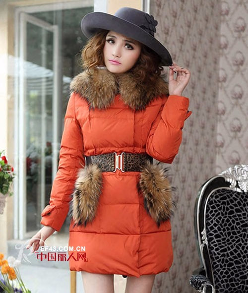 毛料点缀橘色中长款棉衣外套,豪华的貉子毛大毛领,气质高贵优雅。腰封的设计,让身材更加凸显,修身显瘦。