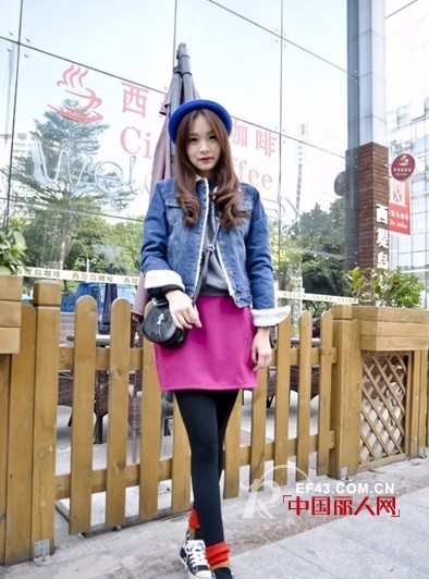 短款牛仔棉衣配上玫红短裙,黑色打底裤配黑色高帮帆布鞋,既时尚又可爱,加上一定宝蓝礼貌,丰富了全身的颜色,整体休闲大气。
