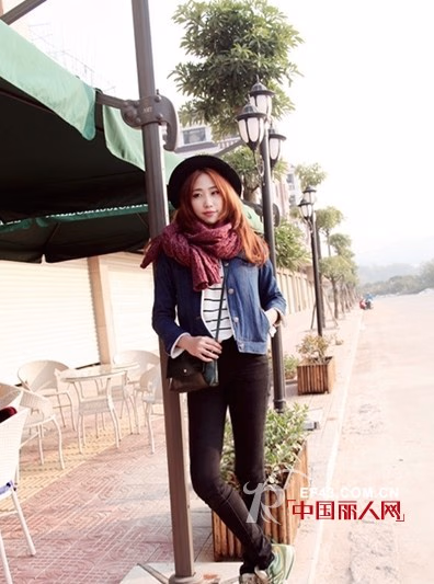 条纹短款T打底,同样的短款牛仔棉服外套作为外搭,高腰紧身长裤使整个人比例非常好,显高又显瘦,酒红大围巾衬得肤色非常白,聪明的搭配。