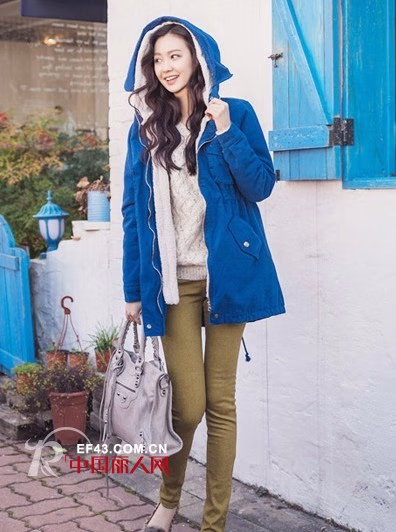 休闲款式的棉服,冬季也很好穿搭,宽松的版型显瘦不会显臃肿呢,而且格外的保暖哦,气质款式的蓝色让MM们的肤色很显白皙,可以拆卸的羊羔毛内衬很保暖,白色的复古风格毛衣搭配上绿色的紧身裤和单鞋,很舒适的搭配,一样让MM们显瘦不显臃肿。