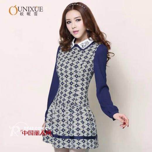 这件花纹拼成,的珠帘式设计清新韩范儿。与墨蓝色的手袖拼接,绣花领子十分的复古,却处处透露着甜美。公主裙摆的设计万分的可爱迷人。下面搭一件黑色的紧身裤,就能将时尚演绎到极致。
