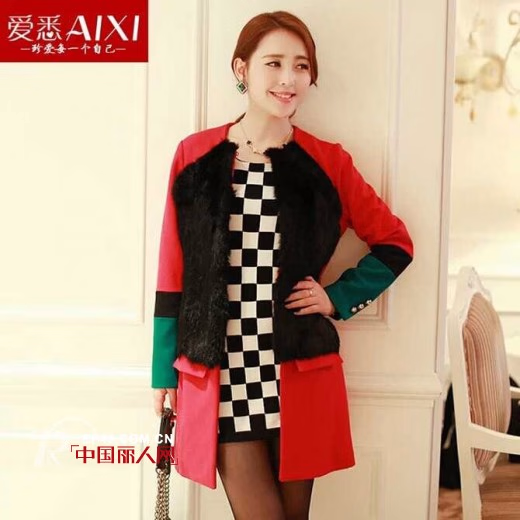 这件呢子大衣由红黑绿三色拼接而成,舒适的面料,修身的裁剪,韩版的设计,适合各种身形的女人。胸前黑色的毛绒点缀,使衣服更加华丽高贵。手袖处的金属扣点缀,有了复古气息,多彩的拼接时尚大方,整体很有大家闺秀范儿。