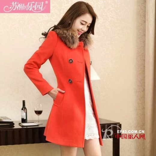 这件橙红色的韩版大衣从领口到衣摆的弧度塑造了一个有曲线的女人,将女人味体现的淋漓尽致。同样的双排扣,新潮中添加了复古元素,很有味道。