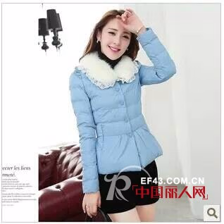 这件浅蓝色的短款羽绒服白色的毛毛领点缀 ,时尚有型。微微裙型的衣摆设计十分甜美。里面搭配一件加厚的修身包臀裙,或者短款的也可以,那样的话就可以在下面搭配一件小短裤,可爱俏皮。