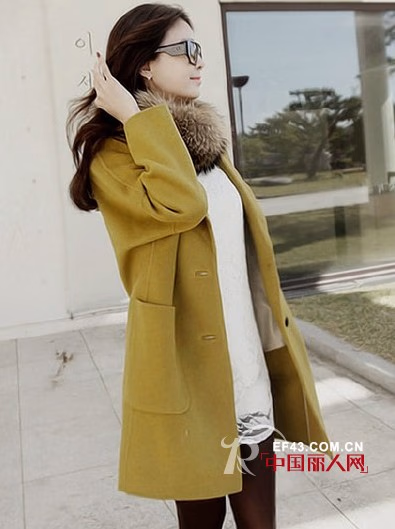 物以稀为贵,并不多见的芥末黄凭这一点就比其他颜色多了几分高贵格调。在注意到细节之前,需要有如此张扬却不咄咄逼人的色彩将注意力凝聚。别致的围脖式毛领,让华贵感升级。