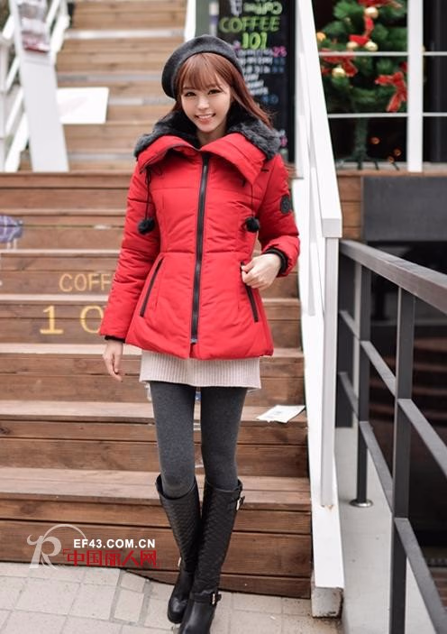 红色翻领棉衣外套+修身针织连衣裙,大气的大翻领,抢眼的色系毛球点缀更增俏皮感,黑色的长筒靴,也在最适宜的时候衬托出纤细的腿部线条。