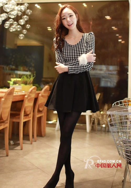打底衫搭配怎么能少的了短裙配上呢?千鸟格款式的打底衫配上一条黑色高腰短裙,简洁的圆领很好的修饰了女性的颈部线条,把千鸟格风格的打底衫塞进高腰短裙里,很显高挑哦。