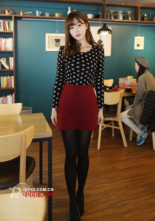 又是一个黑红色相配的款式,黑色打底衫款式爱心点缀,配上针织包臀裙,修身的包臀裙很吸纳身材,在冬季这样的打底款式即不会不过,也可以随意搭配外套就可以出门咯。