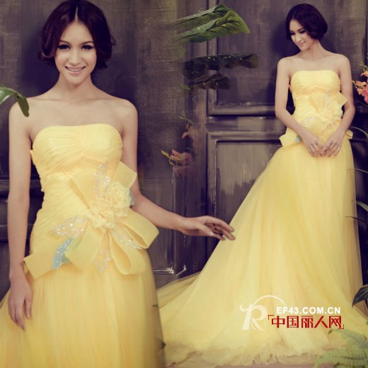 明亮的黄色能够吸引不少眼球,尤其是这种高亮度缎面的礼服更加耀眼。在婚礼上需要注意的是黄色的面积与其亮度和鲜艳度应该成反比。黄色礼服应避免大面积的遮盖,否则会显得沉重和老气,过膝的长度是最佳选择。搭配高亮度的配饰会起到更好的效果。