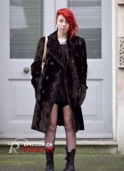 示范搭配:黑色雪纺不规则连衣裙+西装单扣外套+深棕色貂皮大衣+棕色马丁靴+皮革单肩挎包