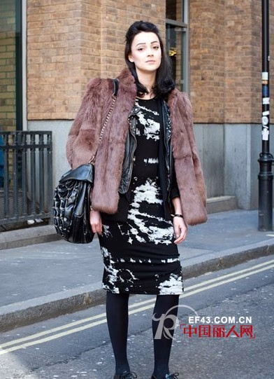 示范搭配:印花一字连衣裙+皮革外套+深粉色貂皮大衣+牛津鞋+拉链皮革单肩挎包