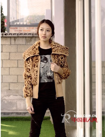 黄色貂皮大衣搭配靴裤,裤子扎在靴子 里面,而高筒靴的铆钉是今年最流行的时尚元素,搭配黑白色调的T恤 ,散发出女性的野性力量。