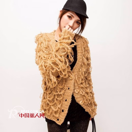 这件落叶黄的衣服开衫的设计,低领刚好隐隐约约的能看到里面黑色的衬衫。外面网状的毛须十分有特色,和其他的针织衫相比,多了分立体感。搭配上黑色的紧身裤,十分个性。