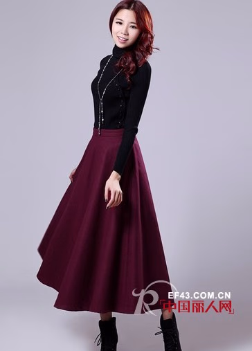 这件酒红色的长款毛呢半身裙伞形的设计,像是斗篷带着点褶皱。上面搭配一件黑色的针织衫,修身显瘦。像这样零下几度的气温,我们就应该搭上一件短款小袄或者长款的呢子大衣。当然,这样的装扮少不了高跟鞋子的搭配了。黑色的百搭经典。