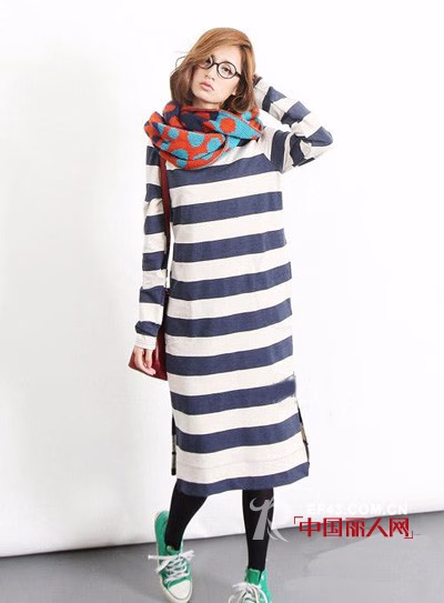 条纹,是粗条纹,这款蓝色和白色相间的长裙,很有感觉的款式,滴底部两边微微开叉有没有像是旗袍的感觉呢?很具文艺气息的款式,配上一条色彩围巾,一双亮色帆布鞋,高个子女生的文艺范,你想拥有吗?