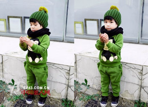 绿色是这一季的流行色,清新的绿色很想让人掐一把,很水嫩的颜色,搭配在孩子身上那就不难想象,孩子穿上该有多受欢迎,绿色的卫衣套装款式,胸前点缀一个可爱小猴子,冬季配上一个黑色围巾,一顶孔雀绿的针织帽,很可爱的装扮。