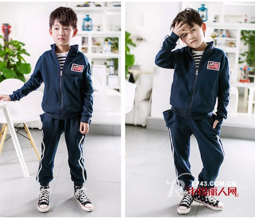 运动装对于男孩来说是一个缺一不可的款式,男孩本身就是爱动,运动套装可以让他不受束缚,这款藏蓝色运动卫衣,拉链的款式,可以作为小外套内搭一件条纹T恤,很潮流的装扮,配上一双黑白相接的帆布鞋,即舒适又时尚。