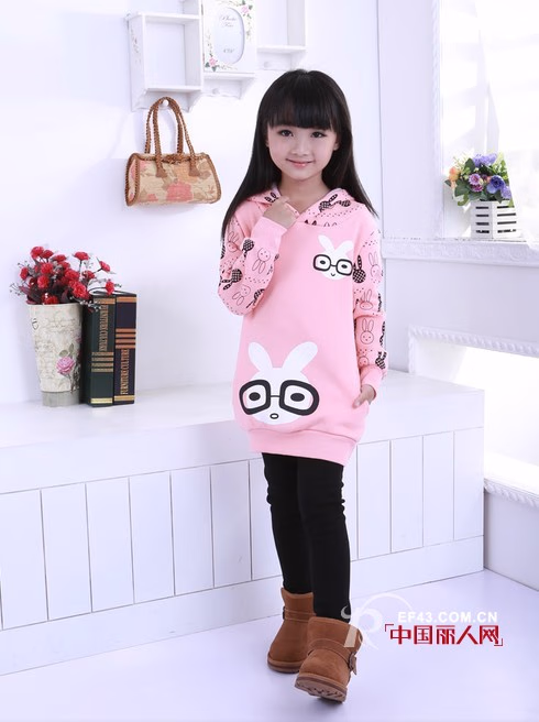 长款的卫衣是最好搭配的,长宽可以随意搭配一个打底裤就可以轻松出门了,这款粉色可爱图案点缀的长款卫衣款式,搭配一条黑色打底裤,一双咖啡色雪地靴,再给你家姑娘剪个齐刘海,绝对的赞哦。
