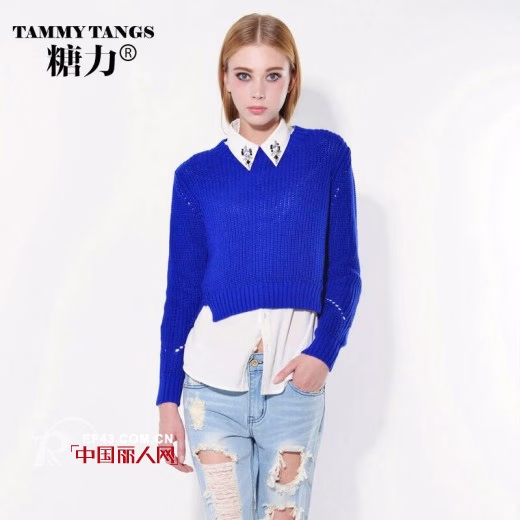 这件由白色棉衫和宝蓝色针织衫拼接的假两件套独特而又精致。两种颜色撞色精彩给人视觉上的快感。下面的乞丐牛仔裤也很有型哦。喜欢就一起收藏吧。