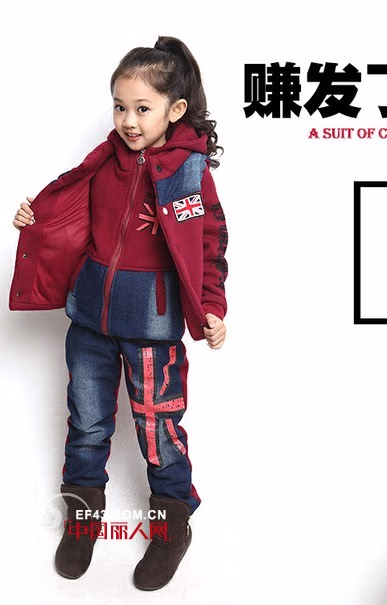 三件套除了有套头的卫衣外,还有带拉链的三件套哦,酒红色是今天最流行的颜色之一,酒红色拼接牛仔颜色,拼接的三件套款式,是不是更具特色呢?同样的拉链卫衣搭配卫衣马甲,加绒裤子,一双雪地靴搞定冬季装扮。